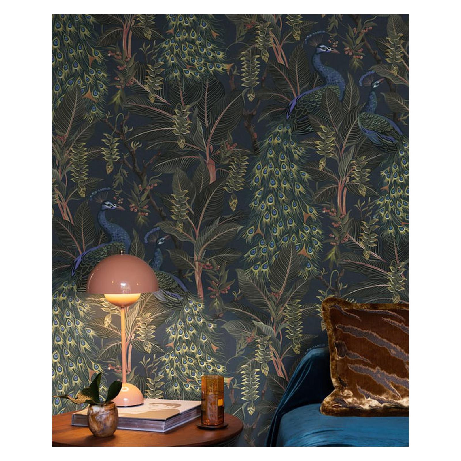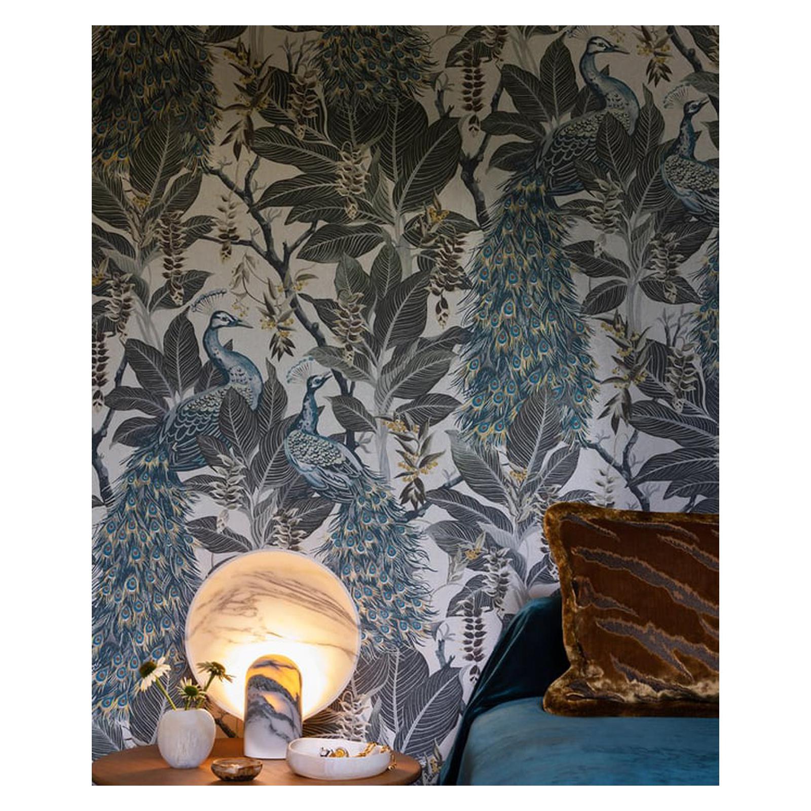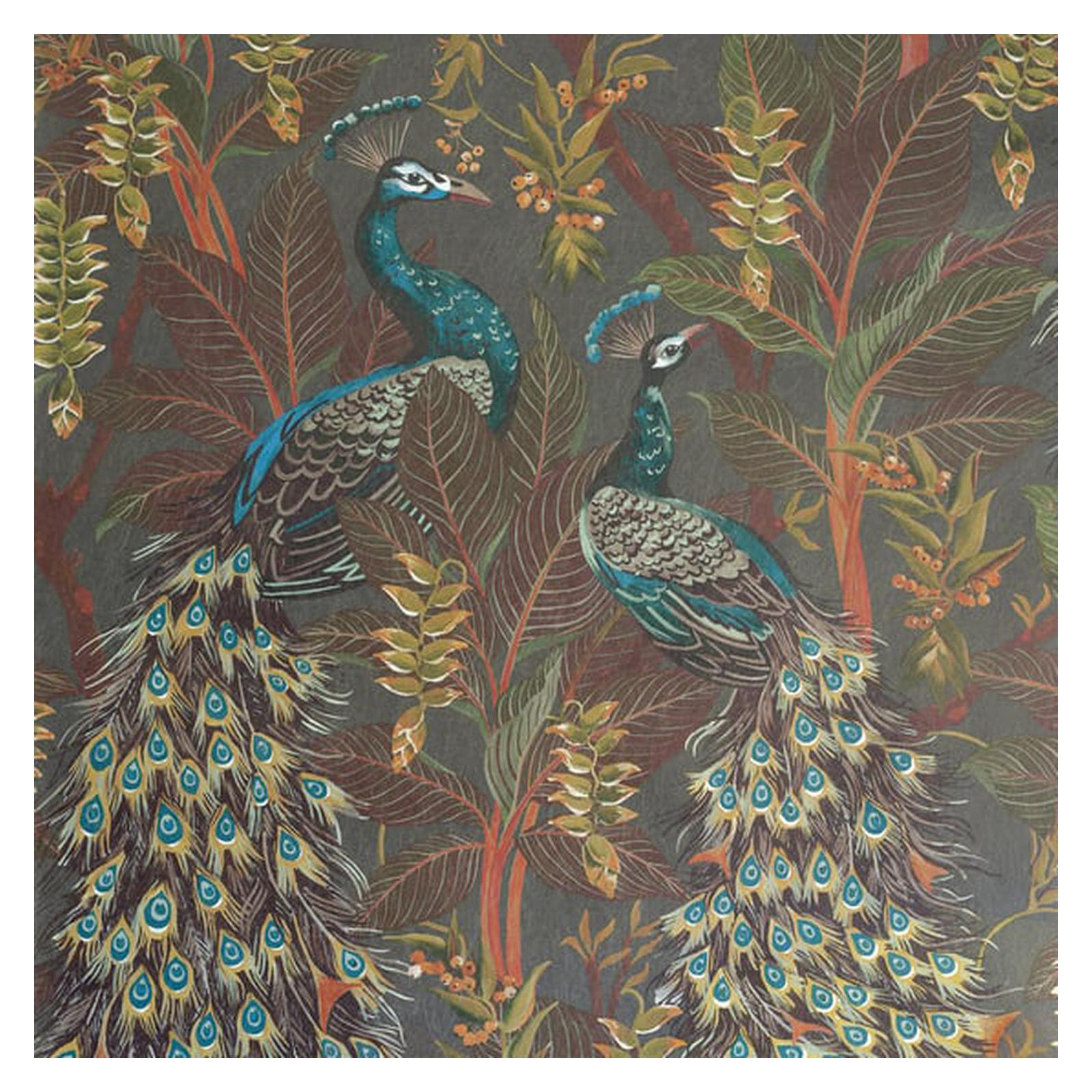 Brightly coloured, stylized peacocks adorn the handmade stained-glass doors which separate the living room from the music room in Elvis’s iconic Graceland home. Regal peacocks sit proudly amongst lush heliconia palms laden with flowers. The design has been expertly hand painted in gouache and digitally printed onto a textured non-woven substrate, replicating the aesthetic of handwoven paper with a subtle iridescent finish.