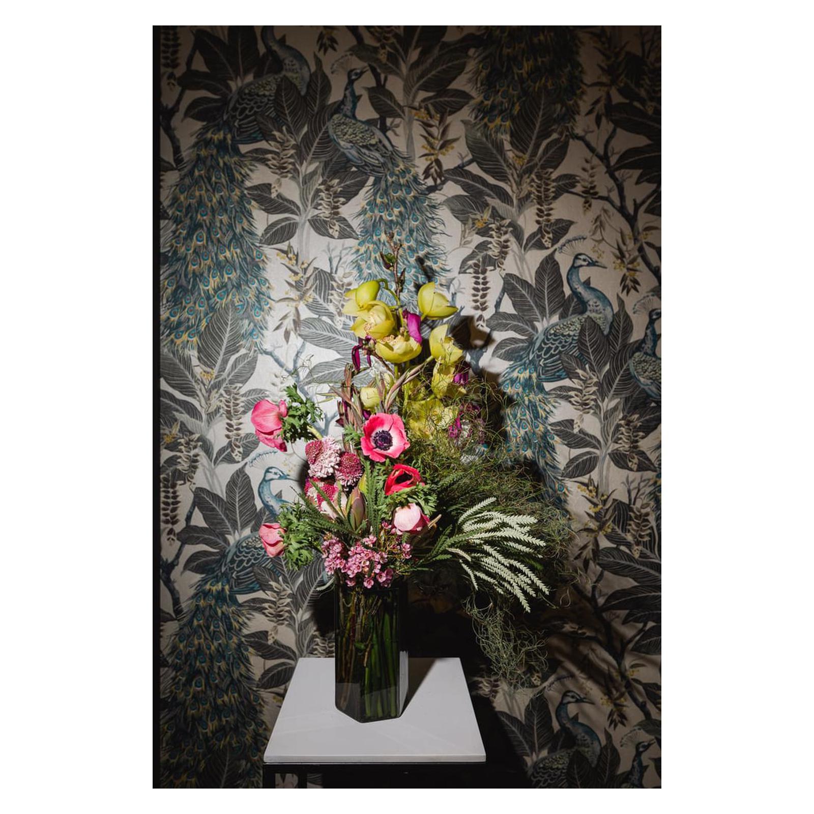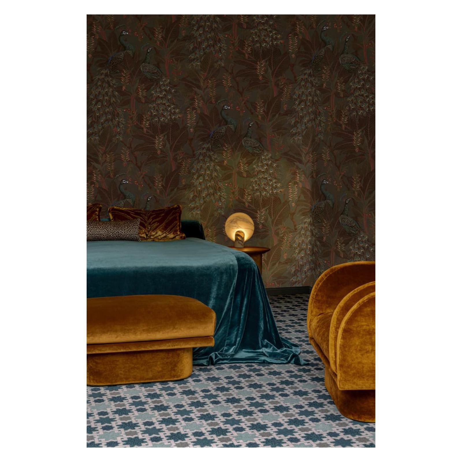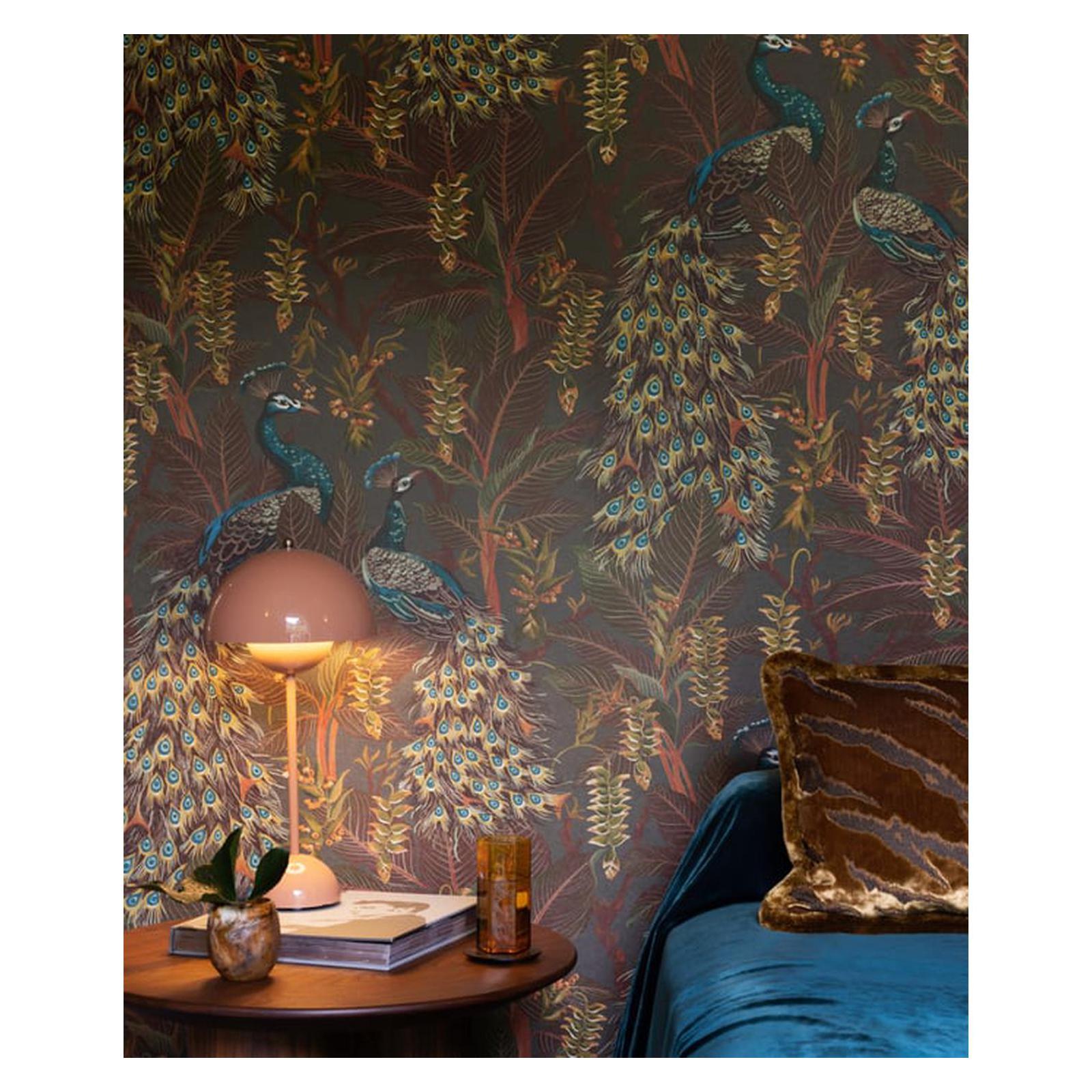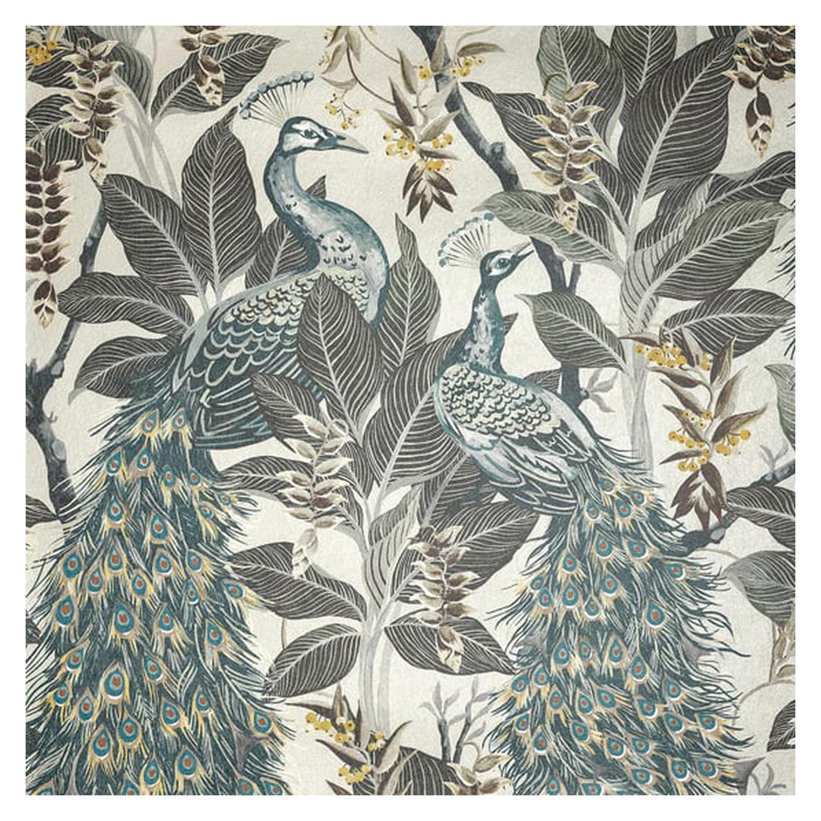 Brightly coloured, stylized peacocks adorn the handmade stained-glass doors which separate the living room from the music room in Elvis’s iconic Graceland home. Regal peacocks sit proudly amongst lush heliconia palms laden with flowers. The design has been expertly hand painted in gouache and digitally printed onto a textured non-woven substrate, replicating the aesthetic of handwoven paper with a subtle iridescent finish.