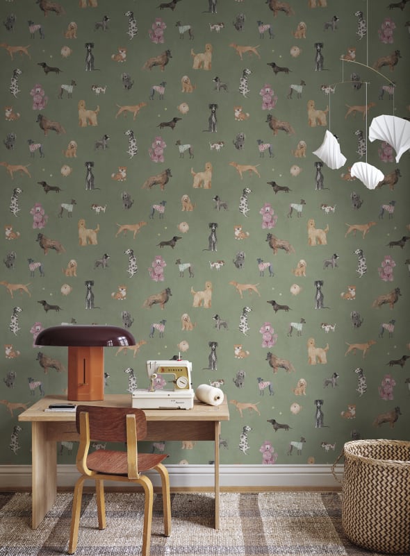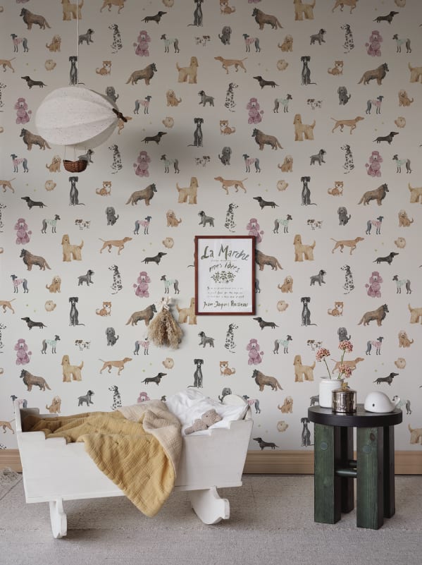 Playful, calm, and genuinely charming. Taiga and Friends is a hand-painted parade of dogs, each with its own personality and expression, arranged in an airy rhythm that feels light on the wall. It is the kind of design that makes a space feel happy without tipping into novelty. Perfect for nurseries, kids rooms, playrooms, family spaces, studios, and anywhere you want a little warmth and humour with Scandinavian restraint.