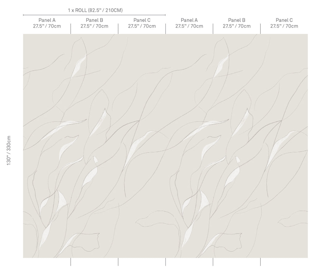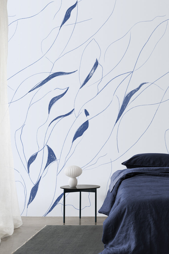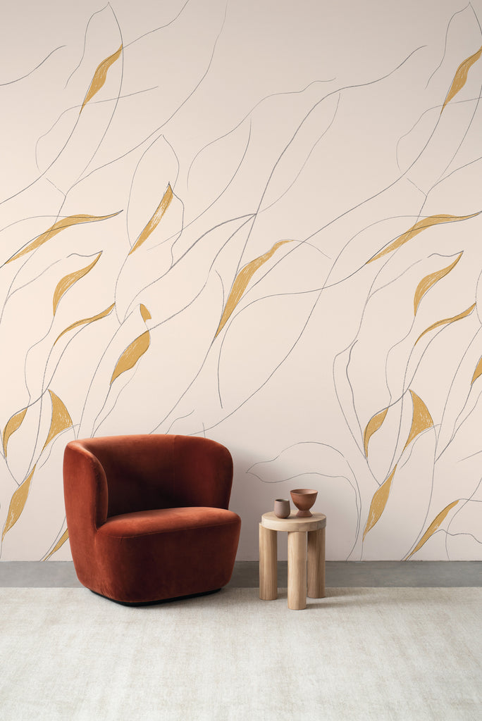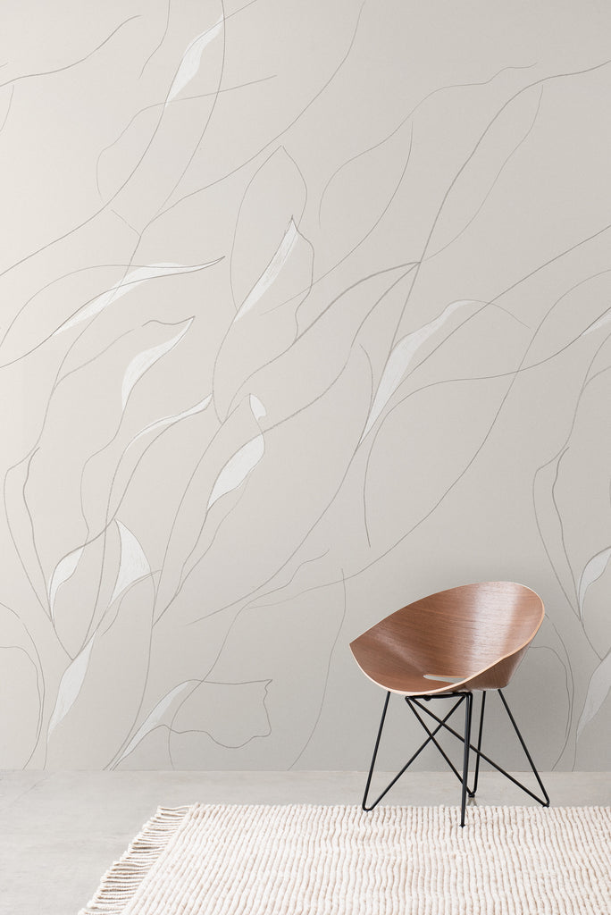 A wandering line traces climbing leaves across the wall—organic, airy, quietly architectural. Vine reads like a hand-drawn mural: soft from afar, artful up close.