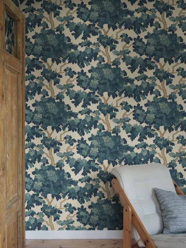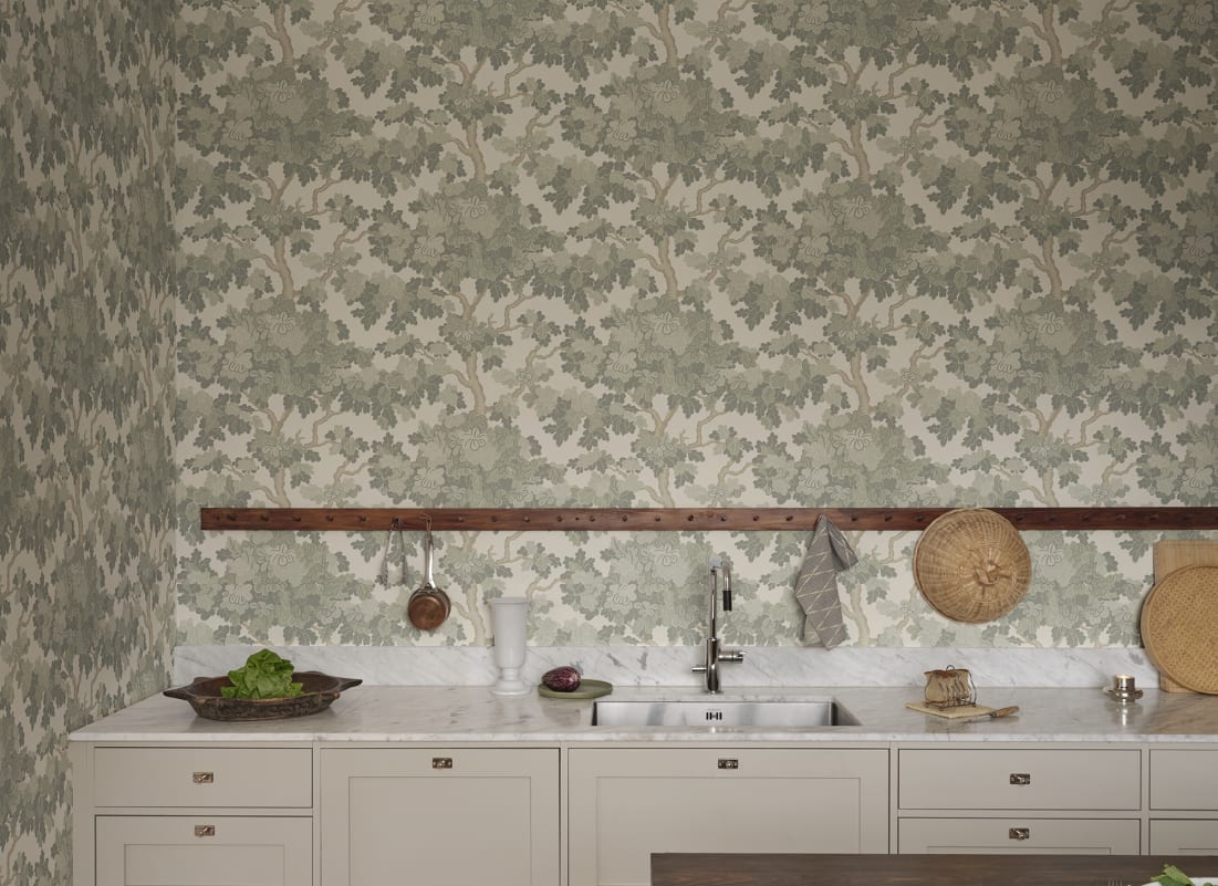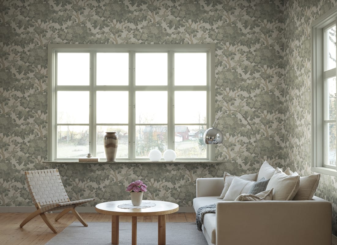 A calm, botanical classic with real Scandinavian restraint. Eken features finely illustrated oak leaves arranged in a balanced, all over pattern that feels detailed up close and quietly textural from a distance. It is an easy choice when you want the room to feel finished without adding visual noise, and it works beautifully in bedrooms, living areas, hallways, dining rooms and studies.