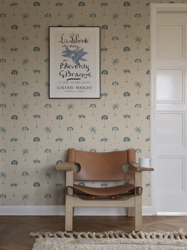 Playful palms, drawn like little ornaments. Milo scatters stylised palm trees across the wall in a clean, decorative repeat that feels both light-hearted and elevated. It sits beautifully in powder rooms, entryways, dining spaces, kids rooms, and anywhere you want a hint of tropical charm without going full resort theme.